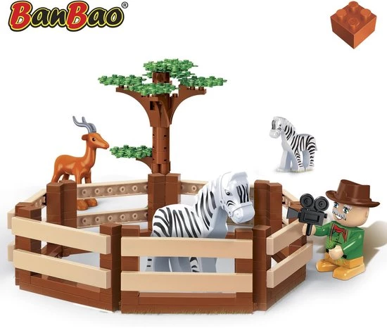 Wil jij de wilde dieren een keer van echt heel dicht bij zien? Dan ben je op de dierenterrein op de juiste plek! Hier worden wilde dieren gehouden en verzorgd. Neem je camera en film de dieren van zo dichtbij als je maar wilt. Bouw de safari dierenterrein met de bouwstenen van BanBao. Plaats de dieren in en rondom de stal en begin maar met spelen! Deze speelgoedset bestaat uit een stal, een boom, een figuur, een antiloop, twee zebras en een camera.