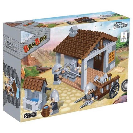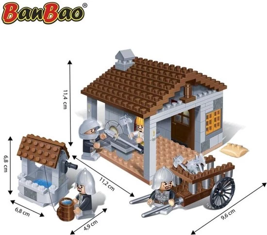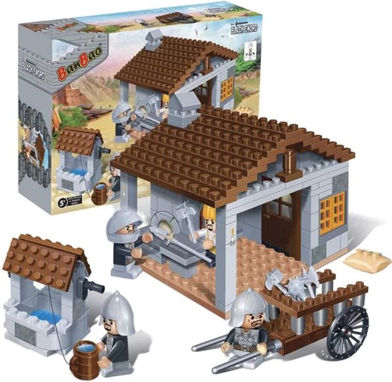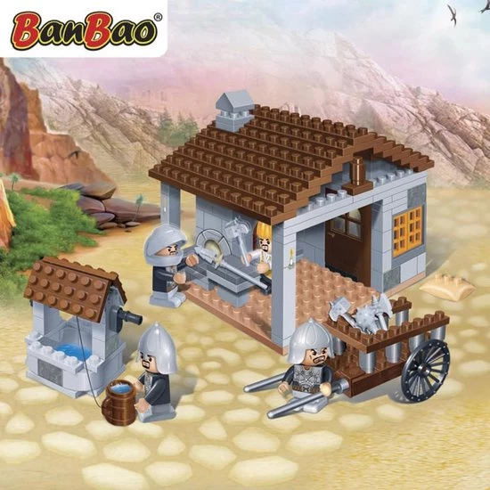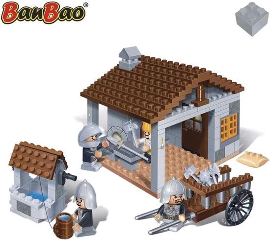 BanBao Kastelen Ijzersmid 8266. De slechterikken bereiden zich voor om het kasteel van de koning over te nemen. Wapens worden gemaakt en gerepareerd. Met het schone water uit de put zorg je dat iedereen genoeg te drinken heeft. Breng de nieuwe wapens en het drinken met de kar naar de andere ridders. Aan welke kant sta jij ? Bescherm je de koning of wil jij dat kasteel ook wel hebben?