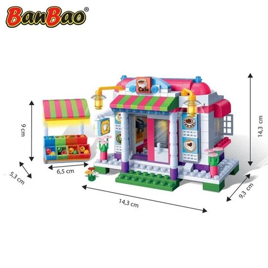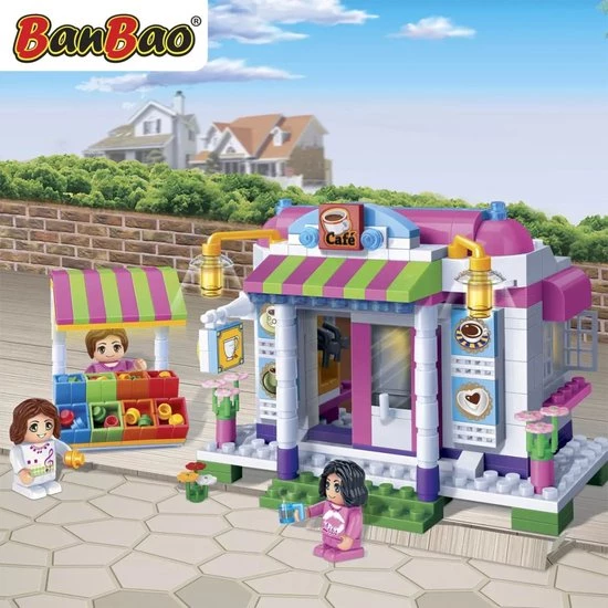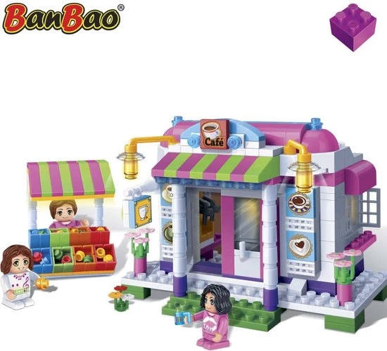 BanBao Trend City Café 6115. Heb jij altijd al graag een eigen Café willen hebben? Dit Café is helemaal van jou. Bouw hem op en richt hem in zoals jij het wilt. Welke koffiesoorten ga jij allemaal verkopen? Probeer zoveel mogelijk op een dag te verkopen! Deze leuke, educatieve bouwset voor meiden bestaat uit: 1 café, 3 figuren en diverse acessoires.De Trendy City speelgoeddozen van BanBao staan garant voor urenlang bouw en speelplezier.Deze speelgoedset bestaat uit 338 bouwstenen.
