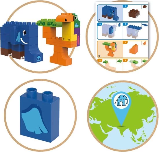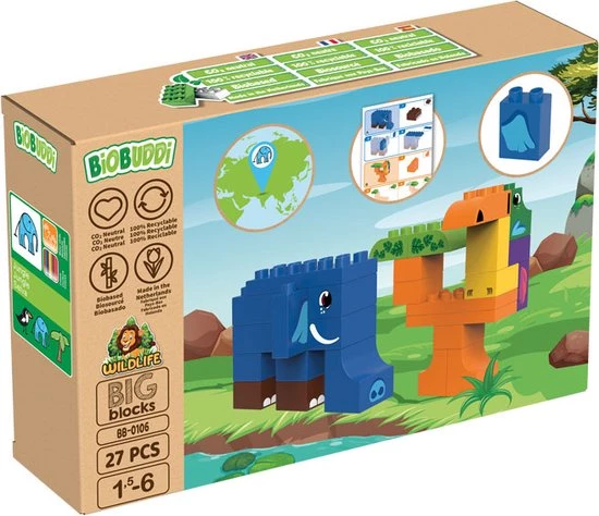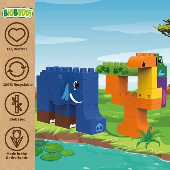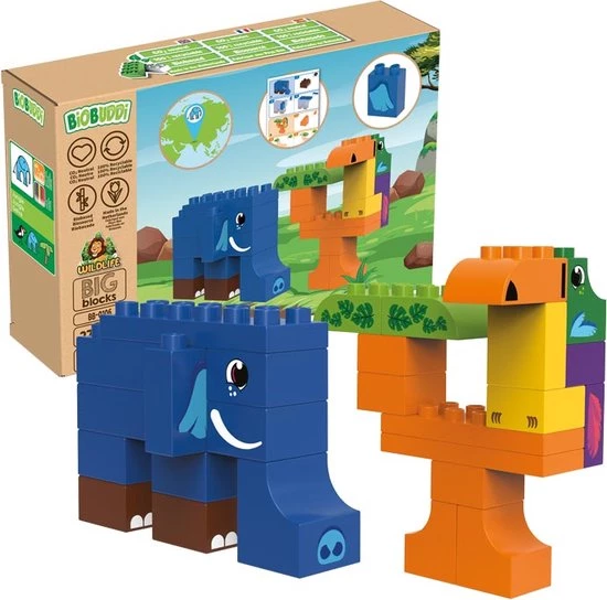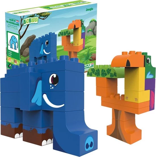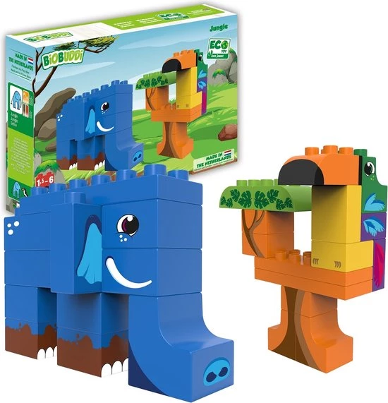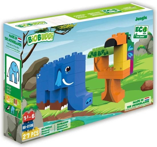 Blokken set met bouwblokken gemaakt van hernieuwbaar materiaal! Het materiaal is erg vergelijkbaar met plastic en is gemaakt van afval van de suikerriet industrie. Laat je fantasie de vrije loop en ga mee op avontuur in de Jungle. Bouw een vrolijke olifant en een prachtige toekan in zijn boom. Combineer de Jungle set met de andere dieren van de Wildlife reeks zoals de olifant,leeuw, giraf en de krokodil (apart verkrijgbaar). De speelgoedblokken hebben verschillende kleuren en maten. Milieuvriendelijk geproduceerd Materiaal: Polyethyleen Inhoud: 27 Bouwblokken, Bouwinstructies.