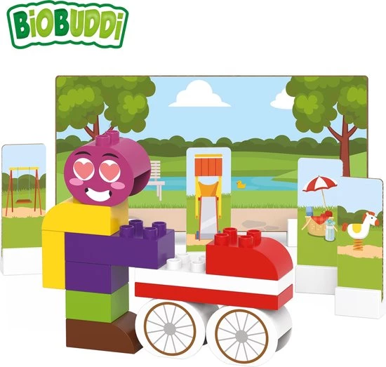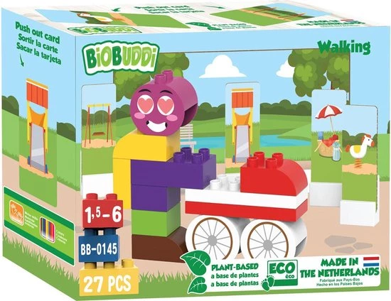 Neem de kinderwagen en neem een tripje naar het park of de speeltuin. Moedig peuters aan om hun emoties op een leuke en inspirerende manier te ontdekken met onze karakters! Peuters kunnen verschillende personages, dieren en huizen bouwen. Waarmee ze hun eigen unieke verhaallijn creëren terwijl ze hun emoties herkennen en leren te begrijpen. De nieuwe speellijn karakters bestaat uit 4 unieke sets. Alle vier de modellen zijn gemakkelijk op te bouwen. De speelset Walking bestaat uit 27 verschillende onderdelen, waaronder kleurrijke bouwstenen die uitwisselbaar zijn met de blokken van andere merken. Maar ook uitdrukkaartjes, kaarthouders en blokjes om alles op zijn plaatst te houden. En ben je uitgespeeld met de set dan bouw je gewoon je eigen nieuwe creatie op. Er zijn oneindige mogelijkheden met de bouwstenen. BiOBUDDi ontwikkelt veilig en educatief speelgoed voor peuters en kleuters. De speelgoedblokken zijn special ontwikkeld voor kleine kinderen om mee te spelen. Bouwen met blokken is goed voor de ontwikkeling van motorische, cognitieve en creatieve vaardigheden. De set stimuleert de leerzame ontwikkeling van het kind. Het speelgoed wordt geproduceerd in Nederland en is niet schadelijk voor het milieu. Het product en de verpakking zijn juist duurzaam en recyclebaar, door gebruik van FSC karton en milieuvriendelijke bouwblokken gemaakt van de suikerrietplant.