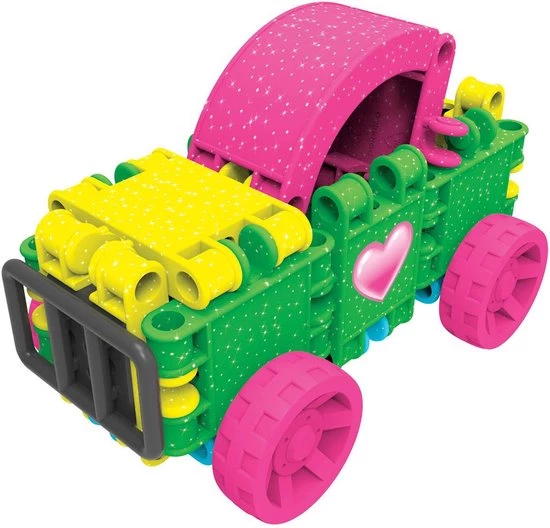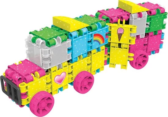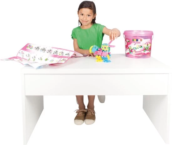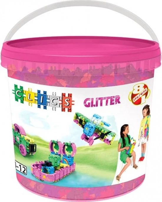 Bouwen met blokken en glamour combineren? Dat gaat prima met de 8-in-1 glitteremmer van Clics. Die bevat lekker veel glitter-Clicsen extra veel accessoires om stralende creaties mee te bouwen. Wat denk je van een handtas van Clics? Of een schitterende caravan mét auto? De echte fashionqueens zullen pronken met zelfgemaakte armbanden of een kroon en de ingenieurs in spe vinden ook het bouwplan van een glitterhovercraft schitterend. Dat is wat Clics educatief én funspeelgoed noemt. Ontdek de 133 Clics, 42 accessoires en vooral veel glitter in deze prachtige emmer.