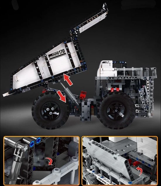 De Miningtruck kiepwagen is prachtig ontworpen en wordt rechtstreeks door de motor aangedreven met een sterke prestaties. (Uitgerust met 2 x XL-motor, 1 x L-motor, 1 x servomotor 1 x 2,4 g remote control,1x batterijdoos)