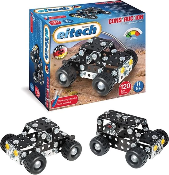 Speelplezier is gegarandeerd met deze constructieset van Eitech met 120 onderdelen waarmee je zowel een pick-up als een jeep kunt bouwen. De doos is inclusief gereedschap en een geïllustreerde handleiding.