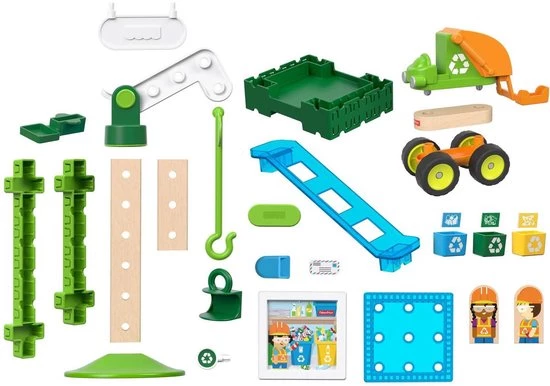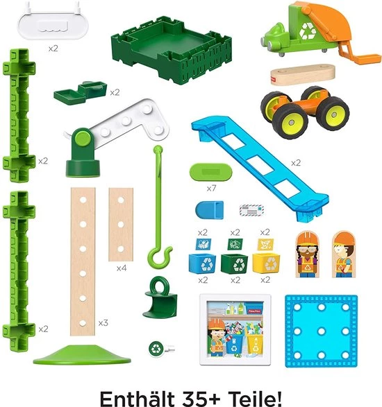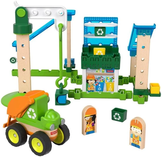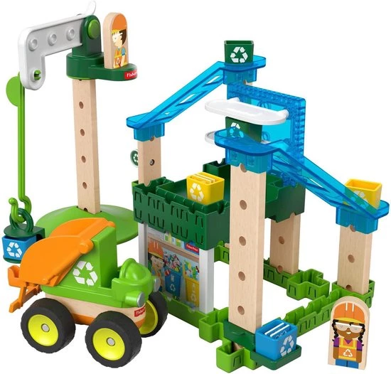 Met deze geweldige combinatie-bouwset van Fisher-Price leren kinderen spelenderwijs hoe ze hun steentje kunnen bijdragen aan een beter milieu! Met het Wonder Makersâ„¢ Hijsen en Sorteren Recyclingcentrum kunnen kinderen kratten met recyclebare producten over verschillende glijbanen omlaag schuiven, op de vrachtwagen laden en de weg op sturen! Kleuters kunnen met de ruim 35 verstelbare onderdelen allerlei verschillende ontwerpen maken en op die manier gebouwen maken of banen voor het voertuig in elkaar zetten. Er zijn zoveel verschillende combinaties mogelijk dat kinderen elke dag een nieuw recyclingcentrum kunnen ontwerpen. Je kunt op alle mogelijke manieren spelen met deze unieke bouwset! Waar ontwikkeling en spel samenkomenâ„¢ Fantasie en creativiteit: Kinderen kunnen hun fantasie de vrije loop laten en door creatief te denken hun eigen recyclingcentrum ontwerpen en verhalen vertellen met de poppetjes. Techniek en bouwen: Door hun recyclingcentrum te bouwen en aan te passen, en onderdelen op verschillende manieren met elkaar te combineren, verbeteren kleuters hun ontwerp- en bouwvaardigheden!