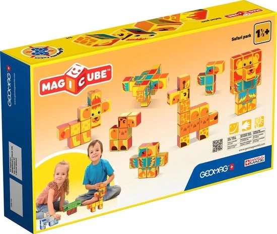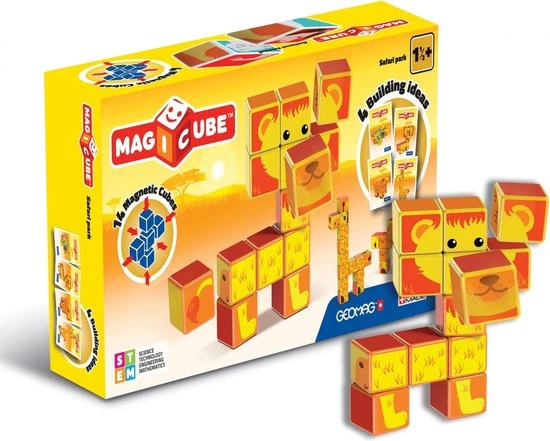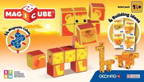 De Geomag MagiCube is speciaal ontwikkeld voor de allerkleinsten. Met deze set kunnen kinderen de klassieke kubus ontdekken. Deze set met dierenthema bestaat uit 14 magnetische blokjes waarmee je 4 verschillende Afrikaanse dieren kunt bouwen.