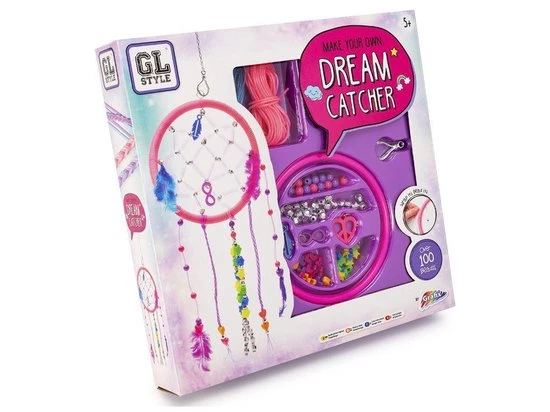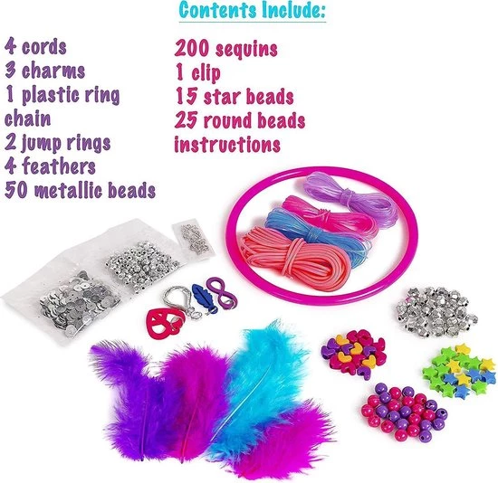 De set bevat: 4 draden, 3 bedeltjes, één plastic ring als basis voor de dromenvanger, een ketting om de dromenvanger aan op te hangen, 2 ringetjes, 4 veertjes, 25 grote metallic kralen, 75 kleine metallic kralen, 200 stuks pailletten, 1 klip, 15 stervormige kralen, 15 hartvormige kralen, 25 ronde kralen en de instructies.