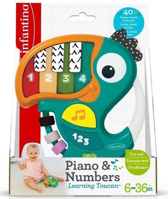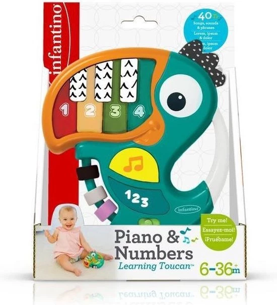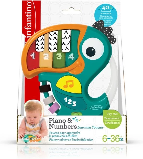 Deze muzikale Toekan met lichtgevende pianotoetsen bevordert baby’s fijne motoriek en geluid-en nummerherkenning. Deze leuke piano bevat 6 liedjes, 18 gesproken woorden en zinnen en 13 grappige geluideffecten.