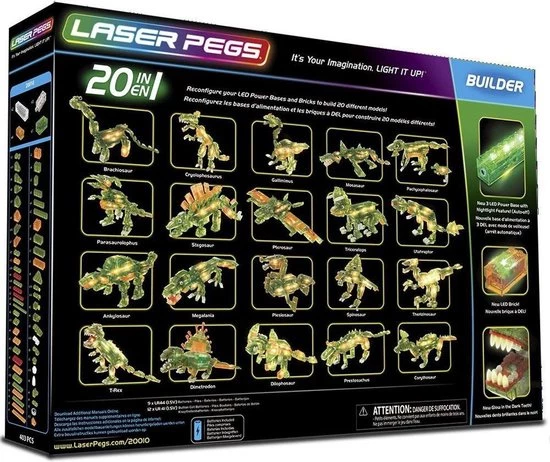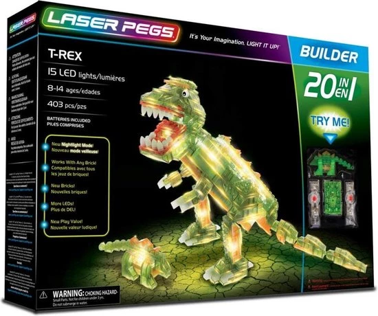 Verken de geschiedenis die 68 miljoen jaar geleden in steen is geschreven en ga op een onbekende reis in de prehistorie om de geheimen van uitgestorven reptielen te ontrafelen. T-REX 20 in 1 is de kit om de beroemdste dinosaurus aller tijden te bouwen: de Tyrannosaurus. Het bevat 403 bouwstenen en 15 LED-elementen waarmee je tot 20 verschillende soorten roofdieren in de zee en op het land kunt bouwen. De gloeiende blokken zijn een geweldige manier om de sporen van de geschiedenis te ontdekken! LASER PEGS – klinkt logisch.