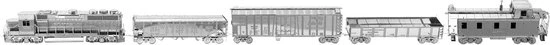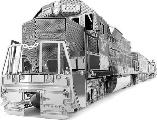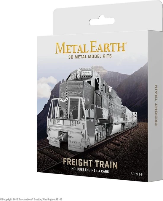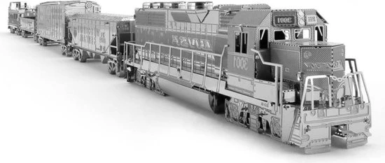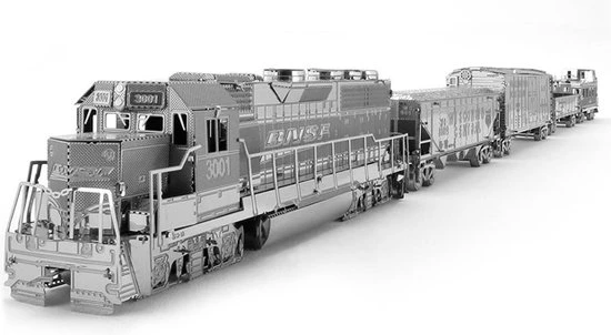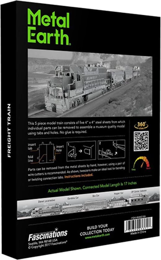 De Freight Train bestaat uit vijf dunne metalen platen. Knip of draai hier eerst alle voorgesneden onderdelen uit. Plooi de onderdelen in de juiste vorm en zet twee stukjes aan elkaar door lipjes of pinnetjes door een gleufje te schuiven. Je kan dit model volledig in elkaar zetten zonder lijm! Een fijne knip- en punttang is wel handig om te gebruiken. In de verpakking staan de handige instructies steeds stap voor stap uitgelegd.