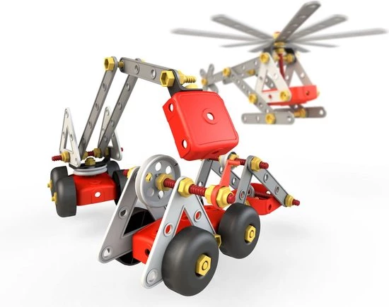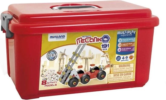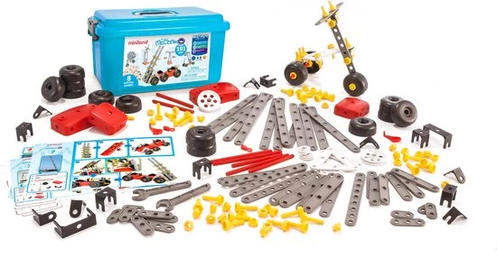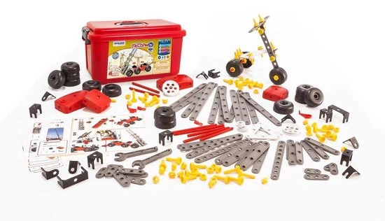 Leer omgaan met techniek en ontdek het principe van bouwen. Deze Mecaniko bouwset bevat 191 montage-elementen, waaronder sleutel, schroeven, moeren, katrollen, enz. en wordt geleverd in een stevige opbergkist met deksel.