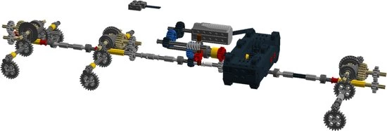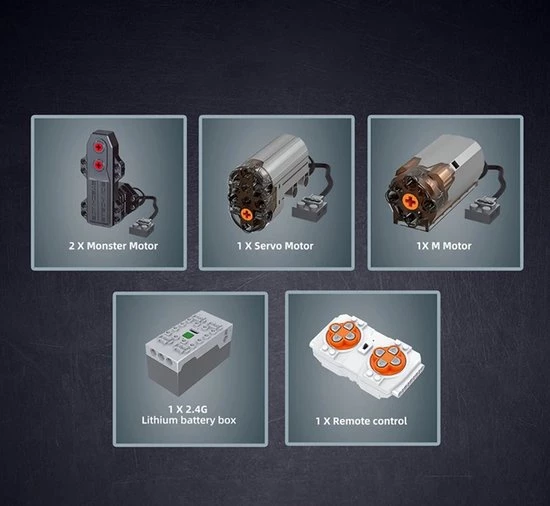 Onderdelen van de vermogensfunctie zijn: 1 x M-motor, 1 x accubak, 1 x afstandsbediening, 1 x servomotor, 2 x monstermotor