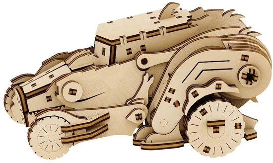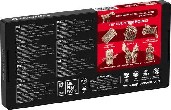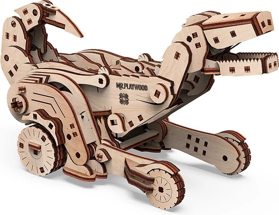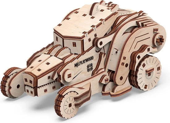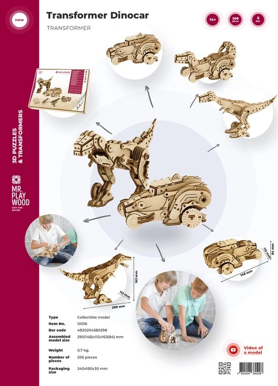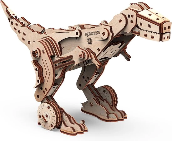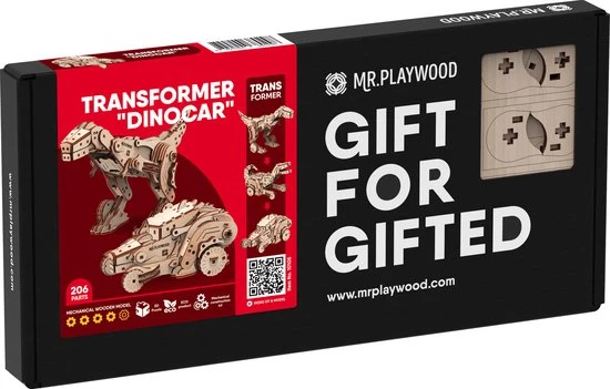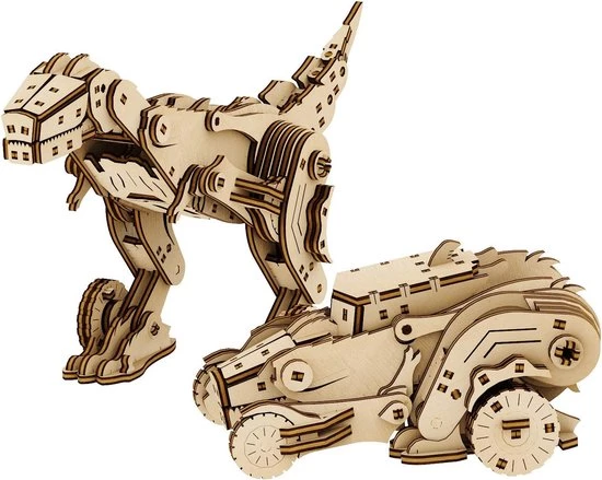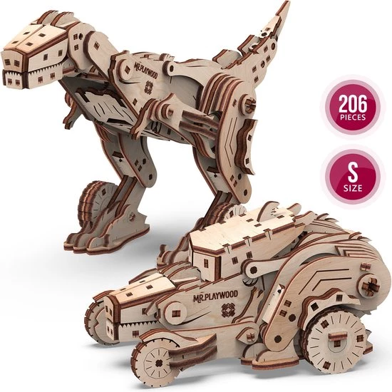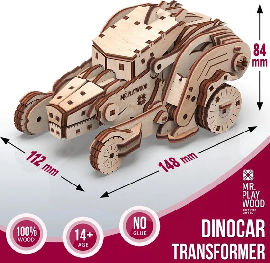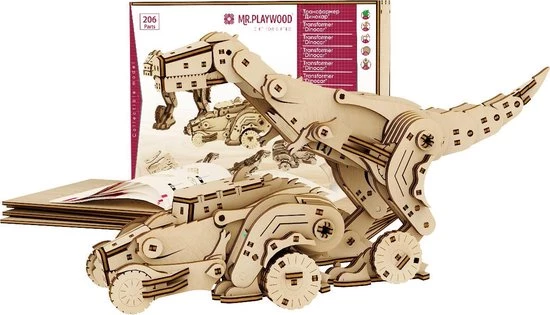 Een mooie, leuke, houten modelbouwset van Mr. Playwood. Maak je collectie compleet met deze dino van de Transformers. Deze dino kun je transformeren in een auto. Het model is een kunstwerk op zichzelf met een bijzondere werking door het gebruik van principes uit de mechanica. Bij deze set wordt geen lijm gebruikt.