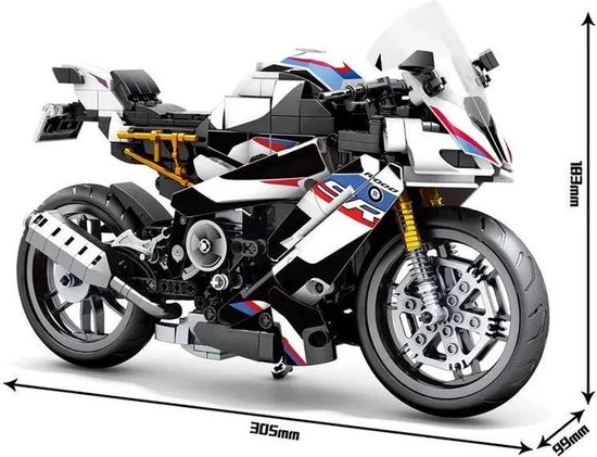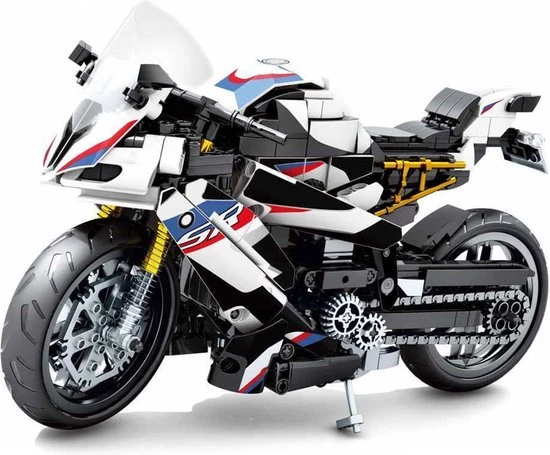 Mooie op een BWM gelijkende motorfiets van Sembo. Deze blauw, witte motor bestaat uit 814 onderdelen en is in de schaal 1 op 6, waardoor de motor ongeveer 32 cm groot is.