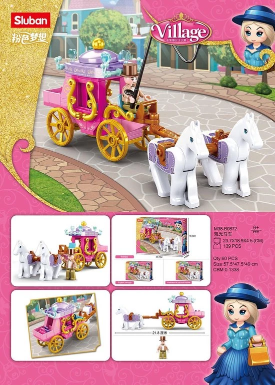 Vooral kinderen kijken uit naar een tocht in een paardenkoets. Deze Sluban Koets heeft de nodige uitrusting voor een geweldige rit. Het bestaat uit 2 paarden, een koetsier en natuurlijke een geweldige koets. De mooie details op de auto laten de ogen van meisjes stralen. De bouwblokken van Sluban passen ook op de bouwblokken van andere merken.