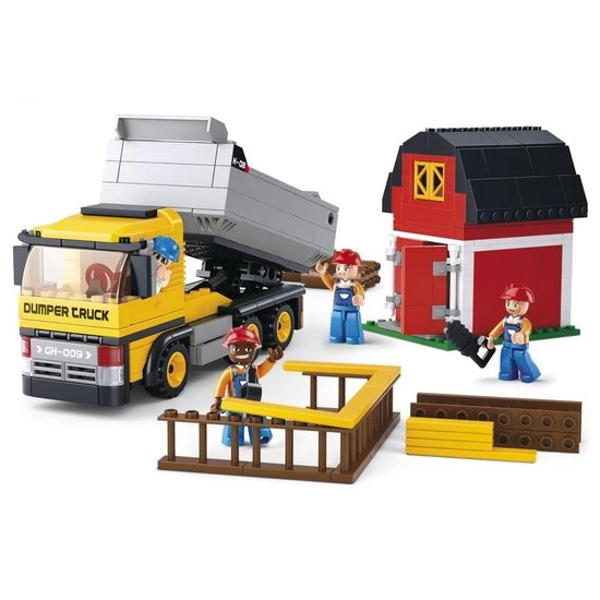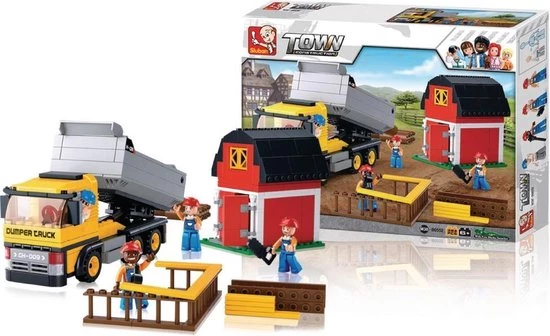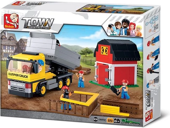 Sluban Grote Kiepwagen met schuur M38-B0552. Inclusief 4 poppetjes en 384 bouwstenen. Sluban past op alle andere merken bouwstenen.Sluban Town Construction – Grote Kiepwagen M38-B0552 met 4 poppetjes en 384 bouwstenen. Tevens zit er een boerenschuur bij
