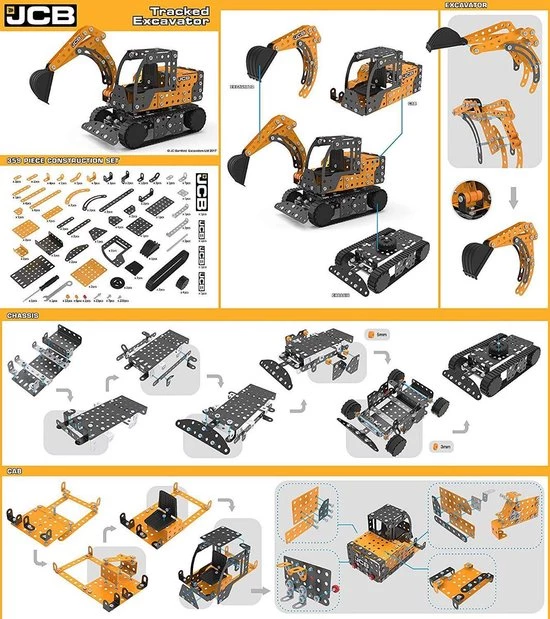 359 stuks. Hoogwaardige, stalen onderdelen gecoat met een anti-oxidatie touch. Alle benodigde materialen en apparatuur inbegrepen. Makkelijk om stap-voor-stap instructies te volgen. Herkenbaar merk van JCB. Geschikt voor kinderen van 8 jaar +