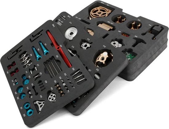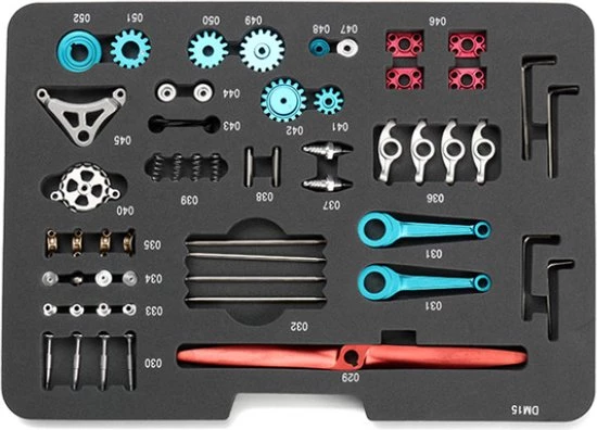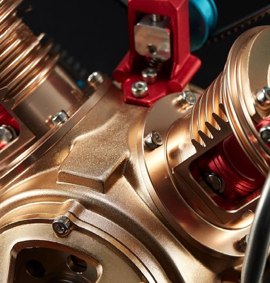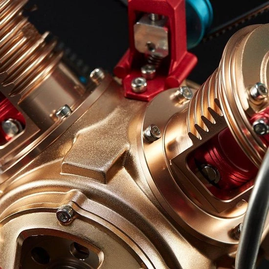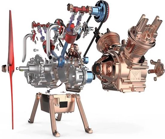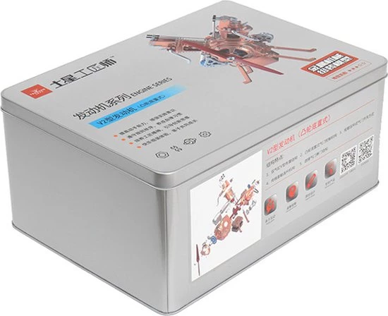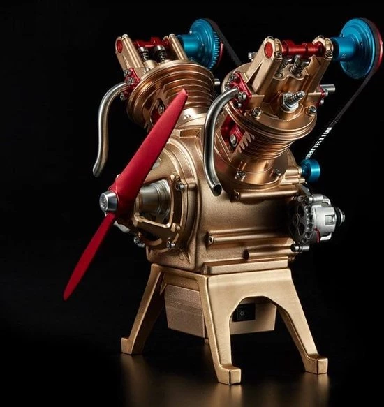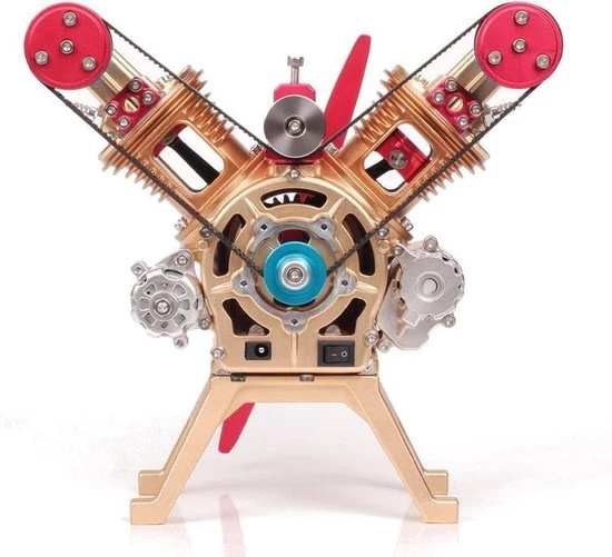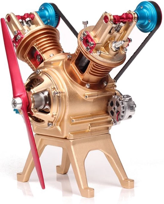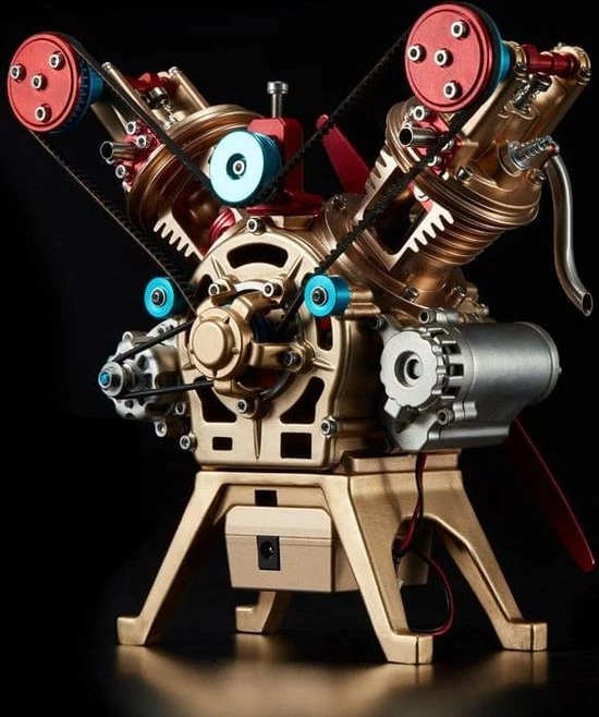 V-motoren worden vooral gebruikt in voertuigen waarin ruimte smal is. Door de cilinders schuin tegenover elkaar te zetten neemt een V-motor minder ruimte in dan een lijn- of boxermotor met dezelfde cilinderinhoud. Ook worden de motortrillingen minder dan met een lijnmotor: de krukas kan korter gehouden worden, waardoor hierin minder moment optreedt. Het bouwpakket bestaat uit 1x Dubbele Cilinder Motor Model, accu, oplader, engelse handleiding en een metalen doos.