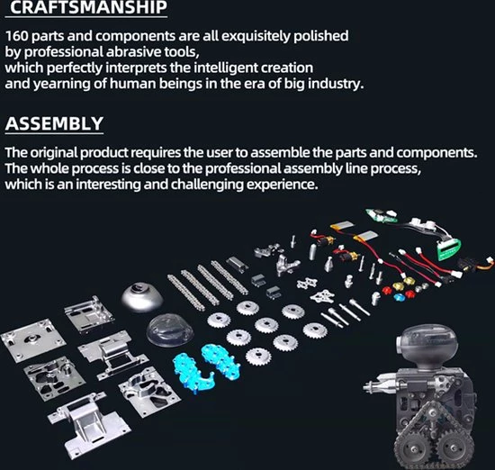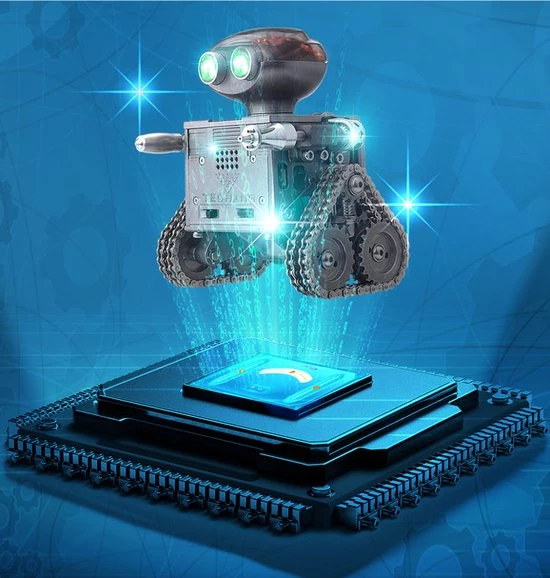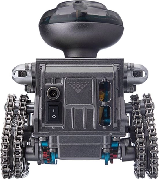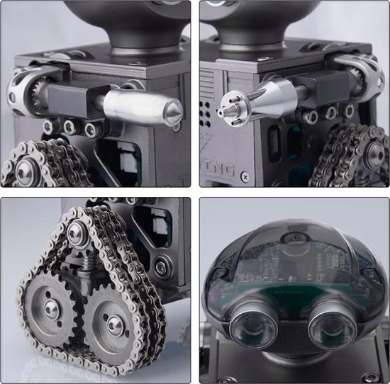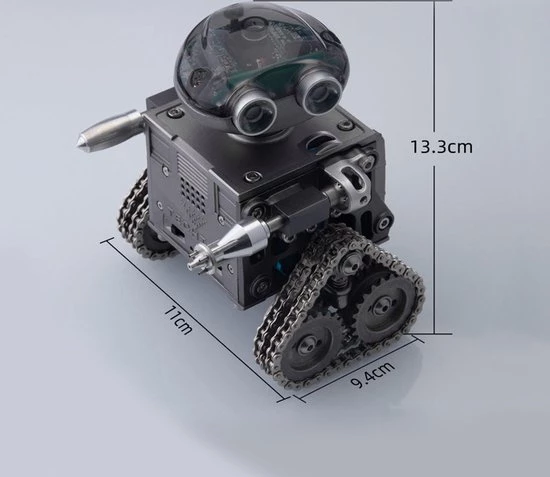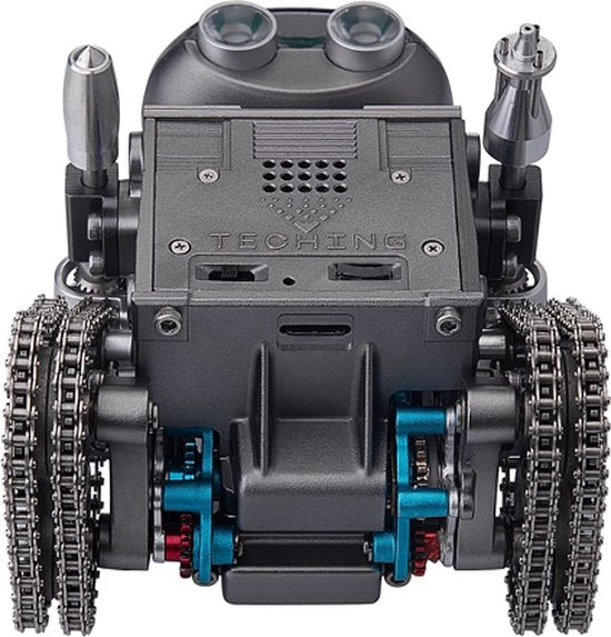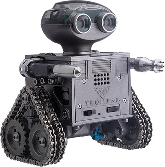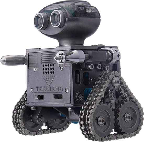 De Teching Remote Control Robot is een “tank” met een paar “ijzeren plaatvoeten”, elektrisch systeem en coole spotlight-overlay, superieure loopprestaties, hoge tractie, niet gemakkelijk te glijden, waardoor de rupsband gevechtsrobot meer kracht heeft en kan ook worden gebruikt als een uniek Bluetooth-luidsprekerornament. Het Teching-team voegt een slimme innovatieve hoofdmodule toe waarmee de slimme robot vooruit en achteruit kan bewegen en 360° kan draaien via app-besturing.