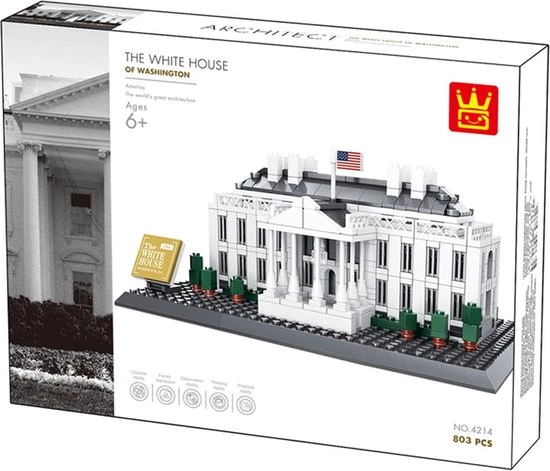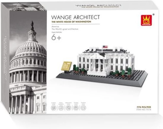 Met deze bouwset van Wange kan je het Witte Huis nabouwen. De set bestaat uit 803 bouwblokjes en een uitgebreide handleiding.