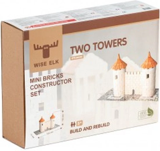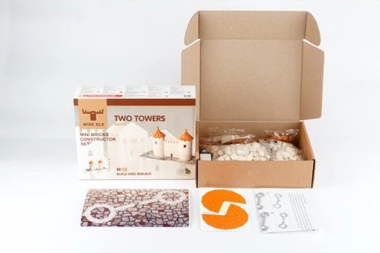 De Two towers bouwset bestaat uit twee torens met een tussenliggende muur met kantelen en een poort. Met de gedetailleerde stapsgewijze instructies lijm je de 470 echte gipsstenen aan elkaar tot een indrukwekkend geheel. Wise elk gebruikt alleen natuurlijke materialen zoals gips en hout. Het pakket is compleet en bevat alle benodigde materialen om het te bouwen. Het leuke van de Wise Elk producten is dat ze herbruikbaar zijn. Zet het bouwwerk een paar minuten onder water en je kan opnieuw beginnen. Omdat de lijm in het water oplost valt het bouwwerk uit elkaar. Droog de bouwstenen en begin opnieuw, of maak er een bouwwerk van naar eigen inzicht.